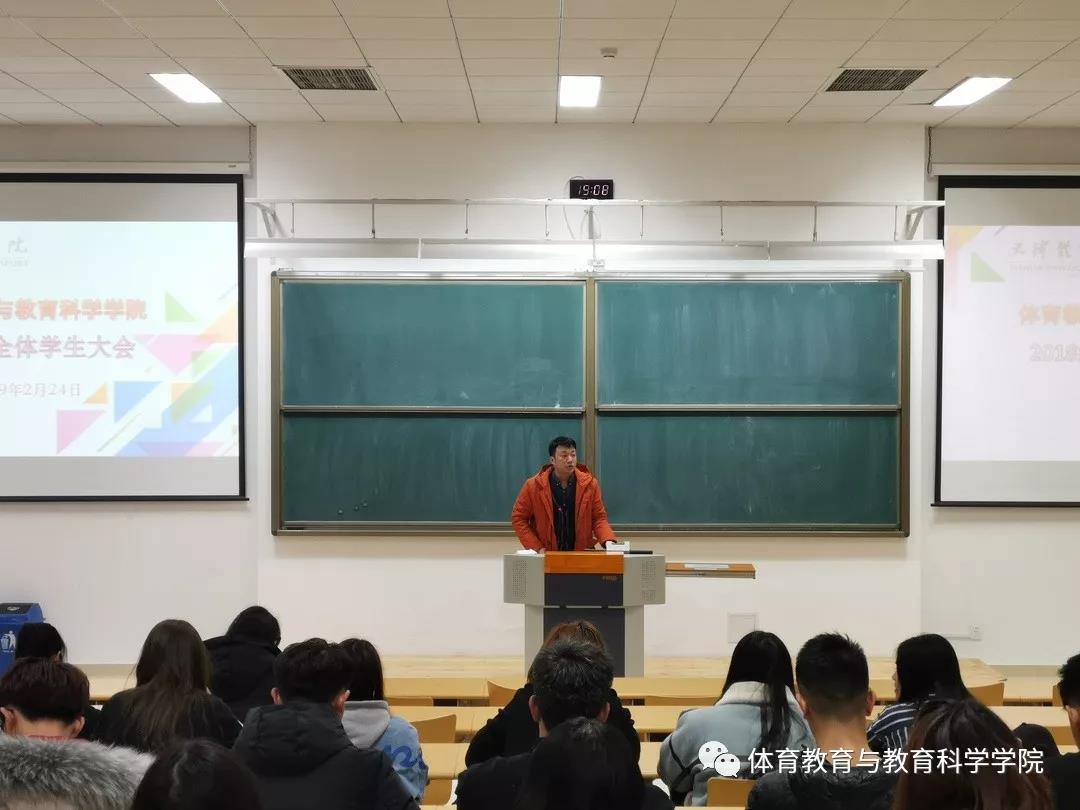 新学期伊始,为更好地推动各项学生工作顺利开展,在开年之际把好脉、立好规、开好头,2019年2月24日,体育教育与教育科学学院召开新学期全体学生大会,由辅导员分别对分管学生进行开学动员和思想政治教育。学院党委副书记刘泽林出席。