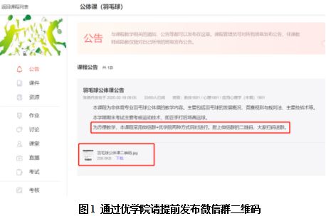如第一周使用优学院前,为防止优学院使用高峰带来的教学效果下降,提前通过优学院发布微信群二维码,并建立教学班微信群(图1)。这样,本人可以根据优学院等教学平台的网络通畅程度,灵活选择优学院、微信群或二者的结合进行教学。