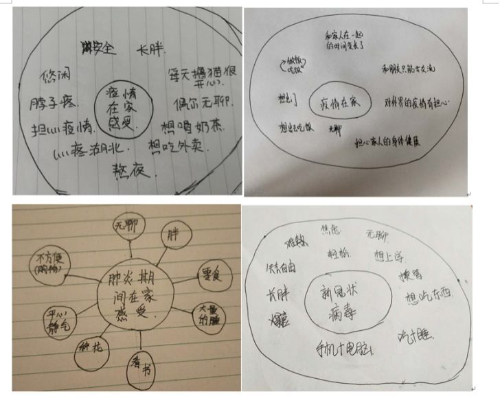 5.在上课的过程中,结合所讲的知识点,适时加入对学生疫情期间的心理调节。比如,上课前问问学生目前家里的防疫情况,再比如,在讲述研究过程时,提到可以使用思维导图来理顺自己的思路,马上就让学生尝试使用圆圈图来写出自己现在在家的心情,并使用微信群及时共享,一方面可以练习课堂知识,另一方面也可以掌握学生的心理动态,并帮助学生进行心理调节。