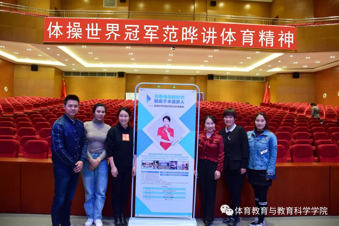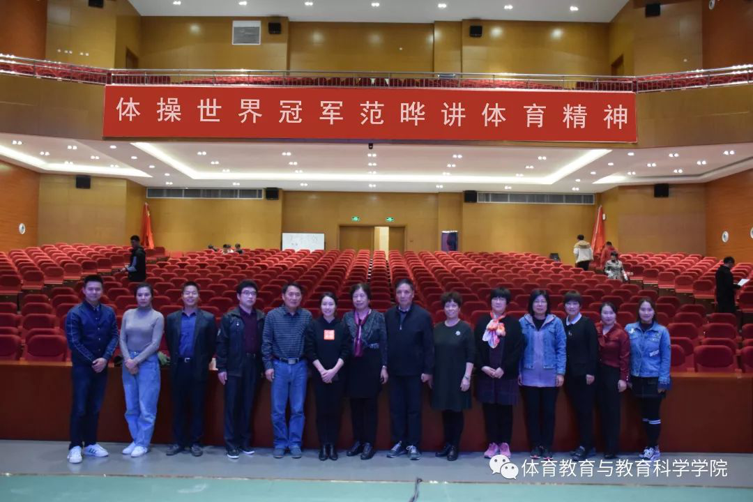 2019年10月28日下午2点,体操武术教研室《体操》课程思政课题组邀请了体操世界冠军范晔在大学生活动中心做了体育精神的宣讲。参加此次讲座的有“课程思政”建设指导组专家邵淑月教授、孙慧敏教授、陈尚伟教授,马克思主义学院高永强院长,体育教育与教育科学学院张运亮副院长,“课程思政”训练营的各位营员们,体操武术教研室全体教师以及体育教育专业2017级和2018级本科生一同聆听了冠军的宣讲。