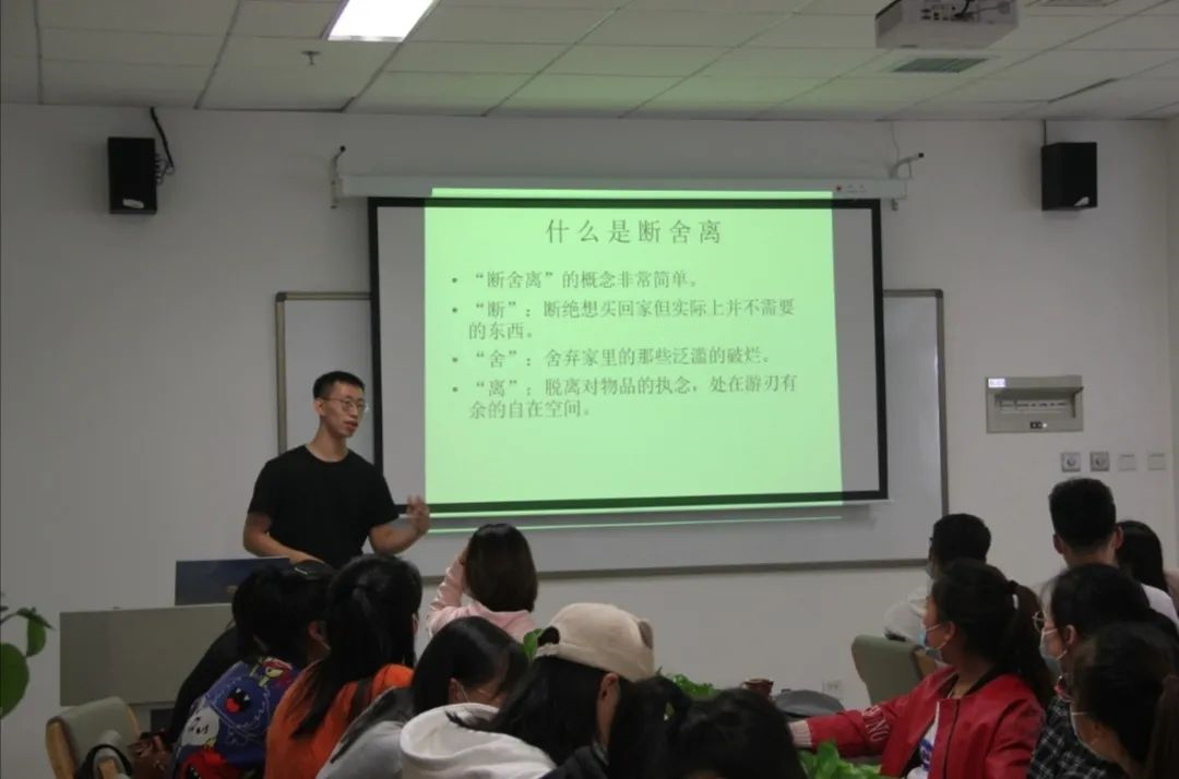 杨一帆同学从山下英子的《断舍离》中得到感悟与同学们热情分享,使同学们了解断舍离的不是物品而是自己心中的杂物,做到了断舍离,人生会变得轻盈而丰富。