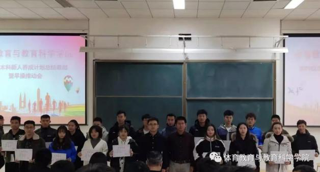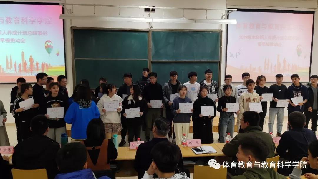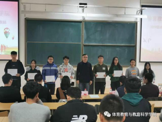 2019年11月29日上午,体育教育与教育科学学院在教学楼A201举行了2019级本科新生新人养成计划总结表彰大会暨早操推动会。体育教育与教育科学学院党委副书记刘泽林、团委副书记钱长浩、相关辅导员,以及学院各年级学生代表参加了本次会议。会议由体育教育与科学学院学生团委副书记王永超主持。