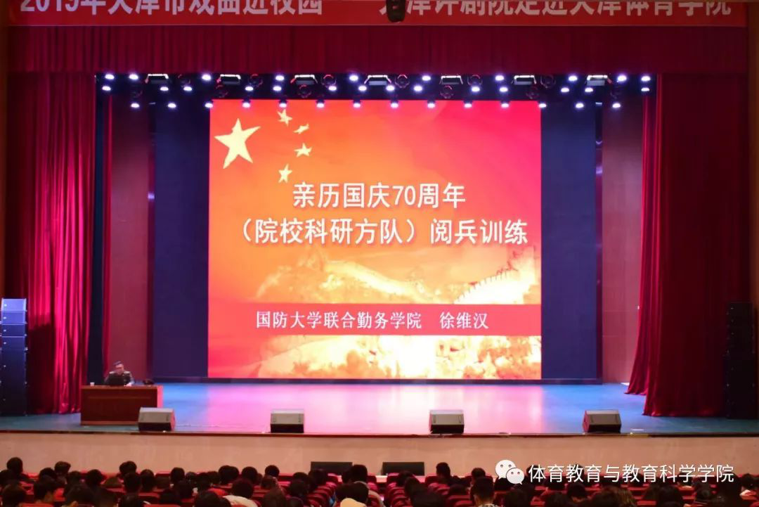 新生带来了一场振奋人心的新中国成立70周年阅兵军事化训练讲座。出席本次讲座的有体育教育与教育科学学院党委书记马桂霞、竞技体育学校直属党支部书记崔沛贤、新生辅导员孙晓竹、李方远。讲座由孙晓竹老师主持。