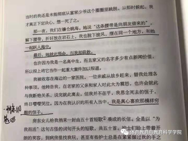 体育教育专业1713高殿森:这是一本给我心灵带来极大震撼的一本书,它以第一人称视角叙述主人公的一生,所以它的代入感极强,常常会让我觉得自己就是书中的那位主角。整本书从开头到结尾都被浸在一种极度压抑的氛围之中,整个故事发展都让你喘不过气来,有时甚至会感到内心深处的秘密好像被人揭穿了,顿时感觉寒毛直立、毛骨悚然、脊背发凉。有人说这本书写的太过于压抑而且充满了负能量,但当我看完这本书后,它给我带来更多的是一些警示。里面的主人公就像一个反面教材一样,让我知道自己不能像他这样思考和为人“生而为人,我很抱歉”这是书中主人公对自己一生的总结,所以这本书给我带来的价值就是,我至少知道了一个失败的人是什么样子的。在之后的生活中,我定会引以为戒,至少做到在回顾我的一生时我能骄傲地说出:“生而为人,我很荣幸”。