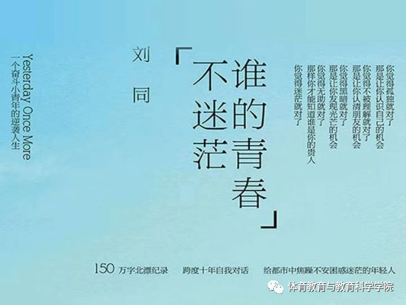 体育教育专业1901刘帆鹭:不要沉迷过去,不要害怕未来,过去。得失也好,成败也罢,无论快乐,还是痛苦,都过去了,你只能回忆,而无法回去。——题记这个行色匆匆的年代里,青春二字总能猛然戳中我们内心柔软。《谁的青春不迷茫》这本书,我可以从许多繁杂的、小清新的、小矫情的叙述中,捕捉到一些对你来说非常有用的东西。“若是你还习惯于曾经,我们可以换个时间、地点,一起沉溺于过去。只需一个适当的原因。而现在,要做的则是让一起更开心。”这是令我印象深刻的一段话。我们谁都不应该去沉迷于过去。我们尝试做一个不动声色的大人了。心绪波动时的忍耐,面对离别时的放下,不沉溺于过去向着光,长大大概就是这样一个过程,带着盔甲,去看世界吧。不沉溺于过去带来的光环。也不因为过去犯过的傻捶胸顿足。坦然面对过去的成败得失,挥鞭向前。十分希望能有这样的读书日记习惯。当某一天下午,这些日记被无意中翻出来,我们再看看,那将会是一个非常有意义的下午,然后感叹到,原来我是这样长大的!