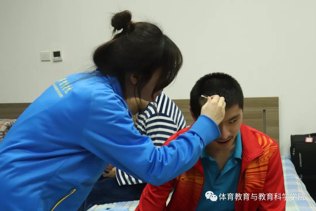 游泳队教练热情的接待了同学们,为同学们介绍了运动员平时的训练及在队里的生活情况,让同学们更直观的感受到了运动员们的艰辛付出,大家都发自内心的希望为他们做些力所能及的事情,同学们在宿舍区域一起帮助运动员们叠被子、整理衣服和生活用品。曾竹心同学还为一位头部受伤的运动员换药并与运动员进行了交流。