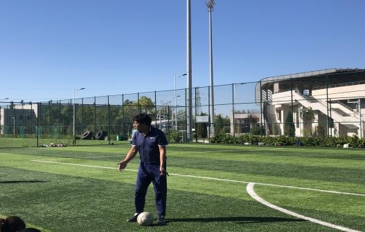 活动开始,王炜华老师向同学们介绍了一些足球运动的基本规则,并亲自进行动作示范,生动形象地描述动作要领,带领同学们完成了脚内侧踢球的学习。紧接着,“球场保龄球”、“天旋地转”等小游戏也有条不紊地开展起来,张明老师和孙志文老师也参与其中,师生们各施绝技,那精湛的脚法、犀利的射门以及精彩的配合博得现场同学们的阵阵欢呼与掌声。