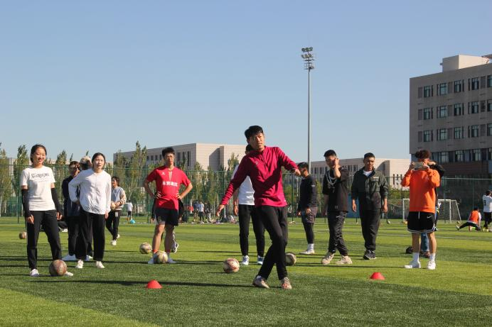 绿茵点亮梦想,激情舞动青春,为营造一个积极、健康、活泼的校园环境,提高体育教育与教育科学学院学生全面素质,促进师生交流,2021年10月11日体育教育与教育科学学院在足球场举办“以球会友,逐梦天体”为主题的师生共建活动,本次活动特别邀请体育教育与教育科学学院副教授、足篮排教研室主任王炜华老师,带领20级、2021级研究生们体会足球运动的魅力。学院团委书记、学生工作办公室主任张明老师和辅导员孙志文老师出席。