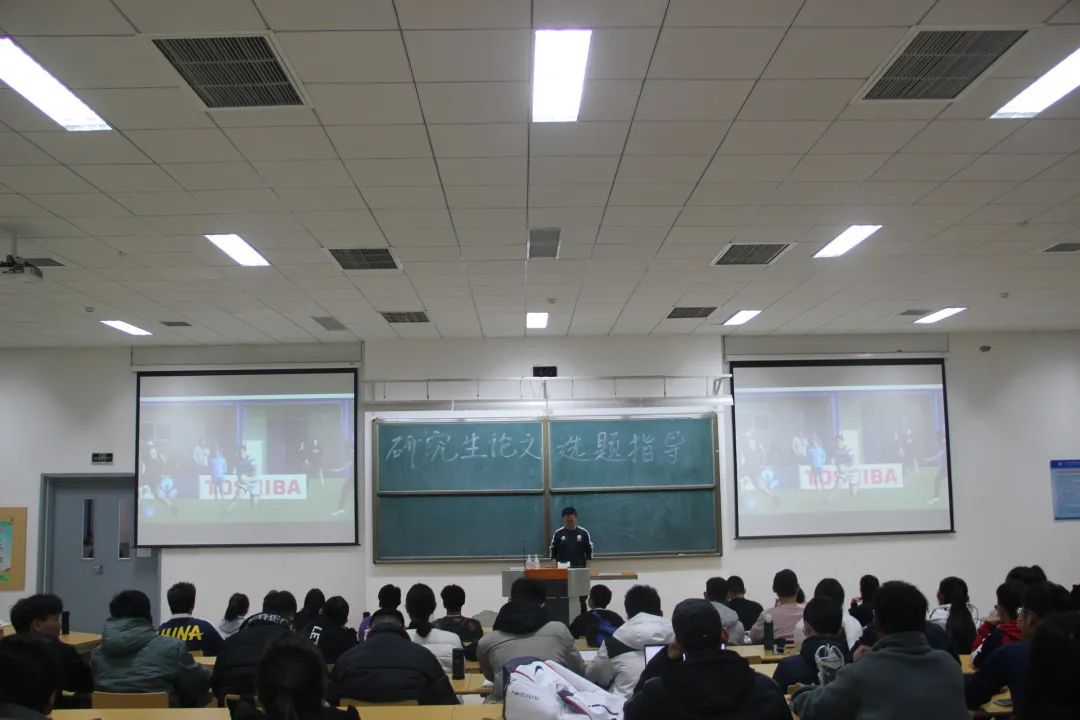 讲座开始,秦旸老师通过新西兰高中生橄榄球比赛的视频,带大家了解体育人身上团结、热情的优良品质。随后,秦旸老师主要从三个方面对大家研究生阶段的论文的选题进行了讲解。首先,大家要找好自己的定位。其次,要提高自身素养,秦旸老师说道,“当我们掌握了一定的专业技能以后,接下来看的就是我们的专业素养,因为研究生培养的是一种思维,是怎样去思考一件事。”最后讲到如何写好论文,秦旸老师说道:“写好论文的前提是选题,论文选对题就等于成功了一半,选题意味着发现问题和提出问题,而发现问题和提出问题是一个人认识能力与知识水平的表现,是创作能力大小的标志。在学习生活中,大家要经常关注具有前沿性的新闻,掌握好科学论文的写作路线,了解论文相关的研究方法。”