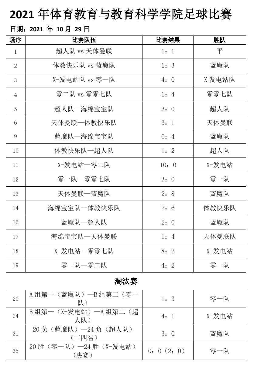 经过两周的激烈角逐,男子组共9支参赛队伍上演了20场精彩赛事。绿茵场上运动员们各显身手、积极跑动、顽强拼搏。其中A组 “蓝魔队”、“超人队”,B组 “X-发电站队”、“零一队”成功进入淘汰赛。体育教育与教育科学学院院长孙延林亲临比赛现场,为运动员们加油鼓劲。淘汰赛中,“蓝魔队”对“零一队”1:3不敌对手, “X-发电站队”对“超人队”4:1战胜对手。“零一队”和“X-发电站队”双双进入决赛。在季军争夺战中,“蓝魔队”以3:0战“超人队”成功拿下季军。“零一队”和“X-发电站队”竞争激烈,难分胜负。场上,运动员精准对角长传,闪转腾挪过人,单刀快速推进,后卫倒地防守,力拔千钧射门,守门员在赛场上迅速巧妙扑救球。场下观众呐喊声、欢呼声此起彼伏,最后两队以精彩的点球大战结束比赛。“零一队”一路过关斩将,最终以2:0的比分优势获得此次男子组的冠军。