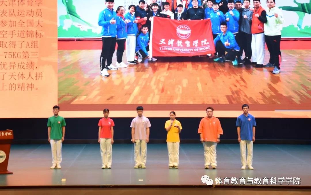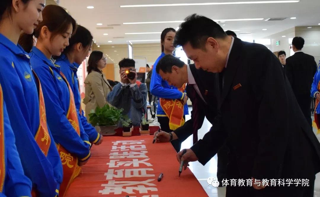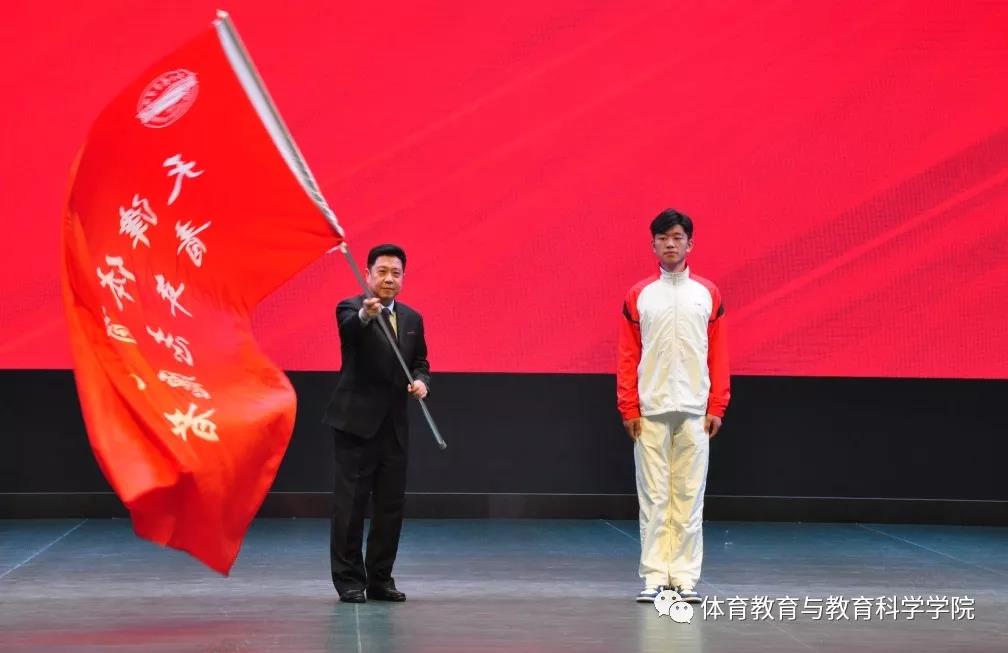 志愿服务团队授旗。(右一为体育教育与教育科学学院本科2017级体育教育专业学生郝之旭)