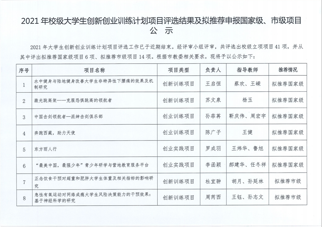 【表彰决定】2021年校级大学生创新创业训练计划项目评选结果及拟推荐申报国家级、市级项目公示