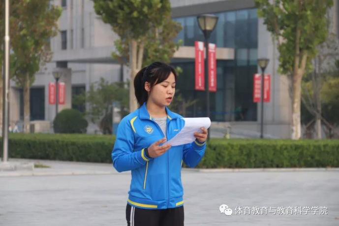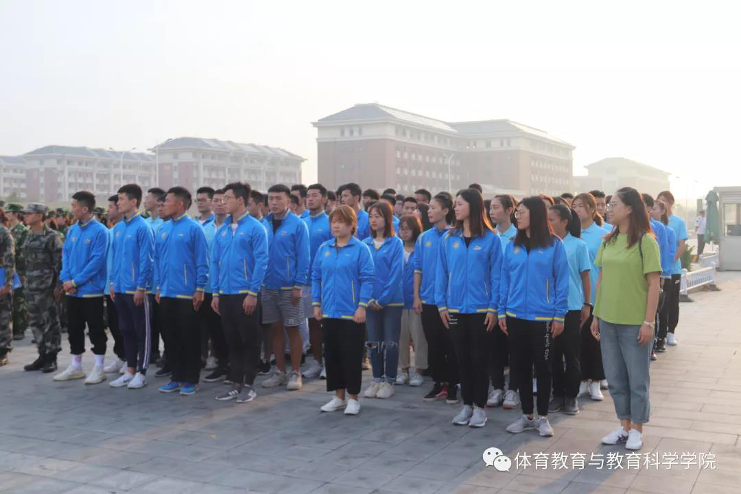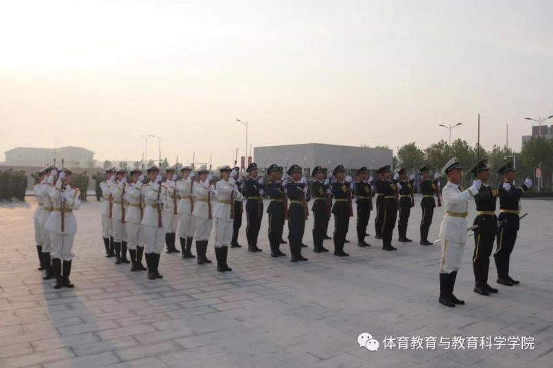 东门广场举行。体育教育与教育科学学院2017级辅导员杨奕娇,2017级学生代表及2019级研究生新生参加。墨盾大队国旗护卫队担任升旗环节任务。