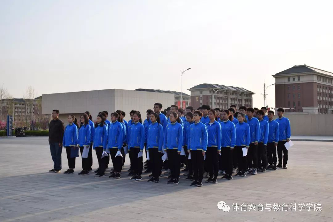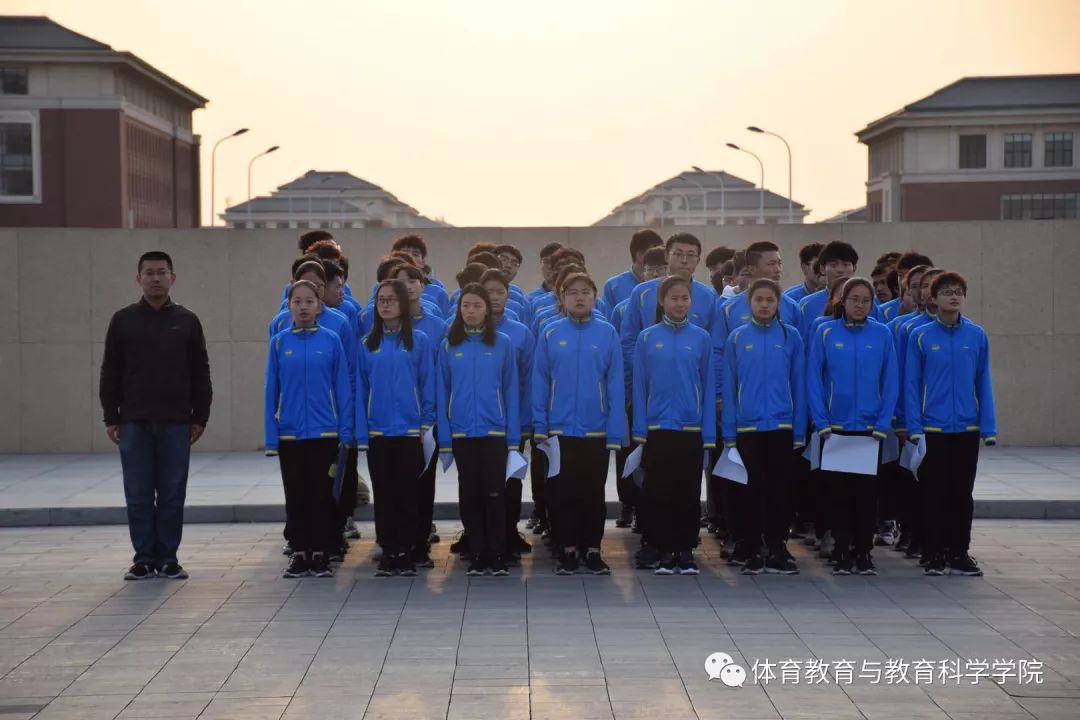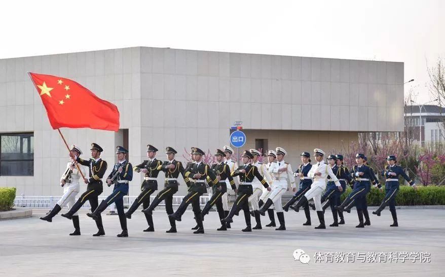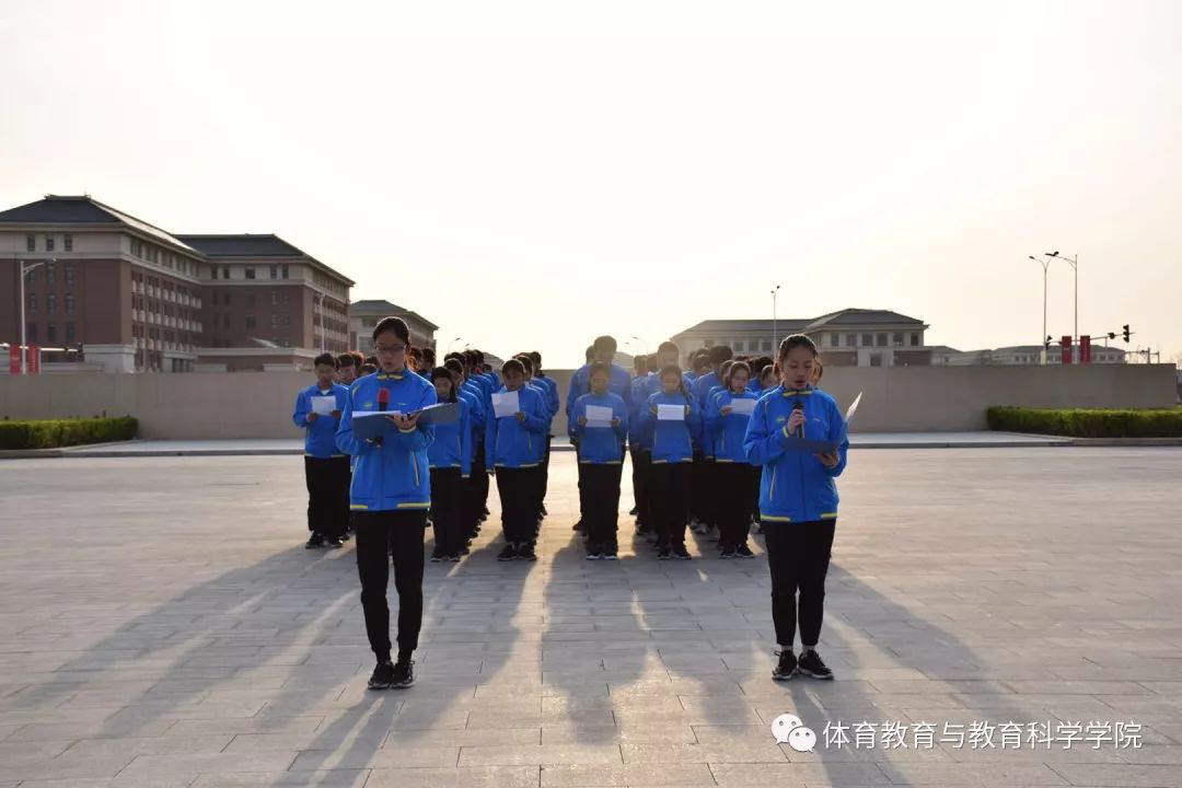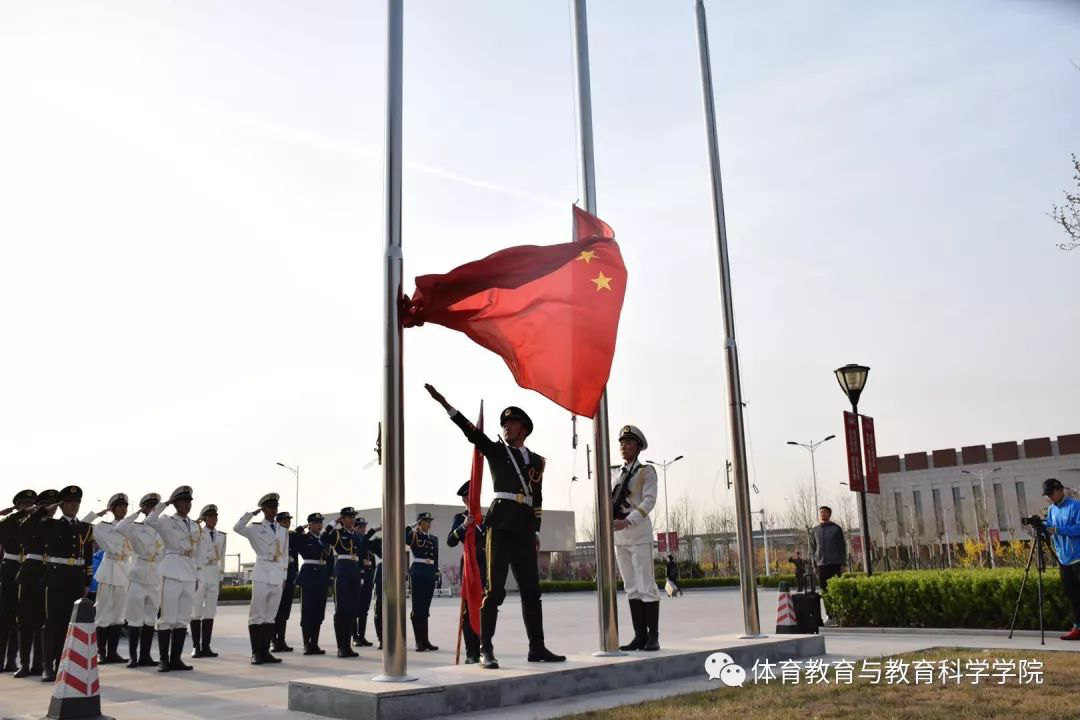 东门广场举行。体育教育与教育科学学院2018级辅导员安明焘、2018级体育教育专业四班、七班全体学生参加。墨盾大队国旗护卫队负责仪式的升旗环节。