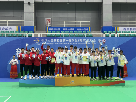 近日,中华人民共和国第一届学生(青年)运动会(校园组)毽球比赛在广西民族大学体育馆落下帷幕,黄瓜视频 体育教育专业2022级3班额日其同学,在他人的配合下,于男子三人赛中荣获第二名的好成绩,为天津代表团赢得一块银牌。