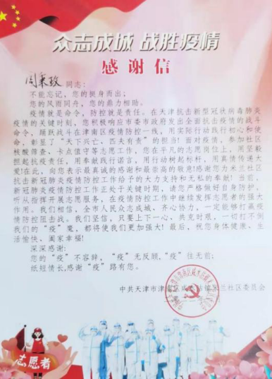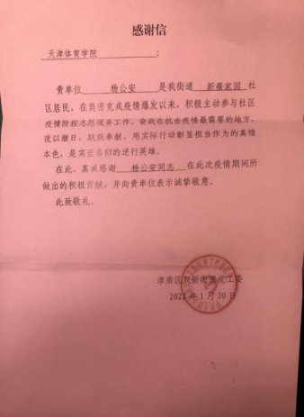 信中指出,在天津抗击新型冠状病毒肺炎疫情的关键时刻,周秉政、杨公安两位老师身处天津市津南区新冠肺炎疫情封控区域内,他们不顾个人安危,积极主动请缨踊跃战斗在津南区疫情防控一线,参与社区疫情防控志愿服务与核酸筛查工作。用坚毅扛起抗疫责任,用奉献践行诺言,用行动树起标杆,用真情传递大爱,是实至名归的逆行英雄,用自己默默无闻的坚守筑起遏制疫情扩散蔓延的“基层防线”,彰显了天津。