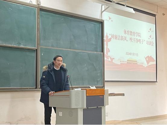 党委书记田向国强调:学院全体教职工要牢固树立廉洁意识,筑牢廉洁底线,抵住诱惑,守住执裁“廉洁关”,努力营造“讲廉洁、讲公正、讲正气”的良好执裁氛围。