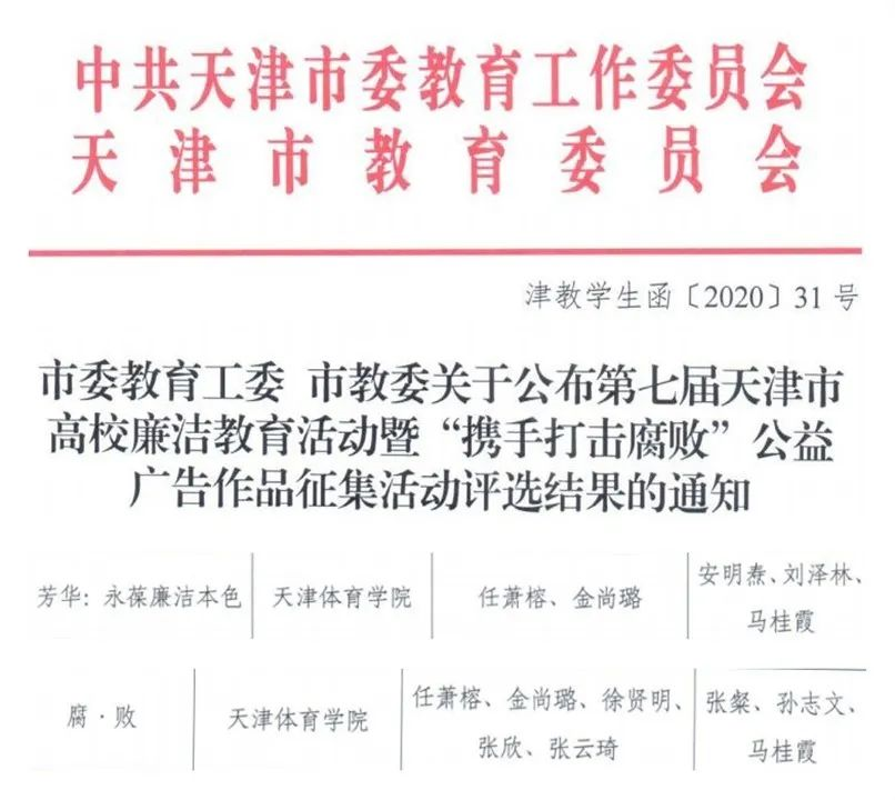 此次征集活动学院党委高度重视,在马桂霞书记、刘泽林副书记的指导下,任萧榕、金尚璐、徐贤明、张欣、张云琦等同学在第七届天津市高校廉洁教育活动暨“携手打击腐败”公益广告作品征集活动中以《腐·败》获得网络新媒体类作品的二等奖、任萧榕和金尚璐的《芳华:永葆廉洁本色》获得表演艺术类作品的二等奖。